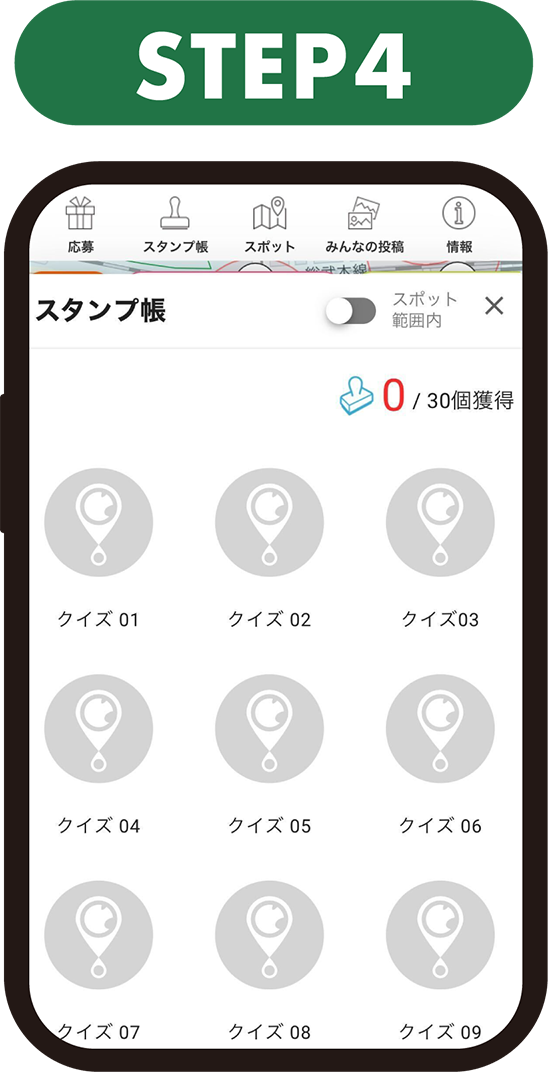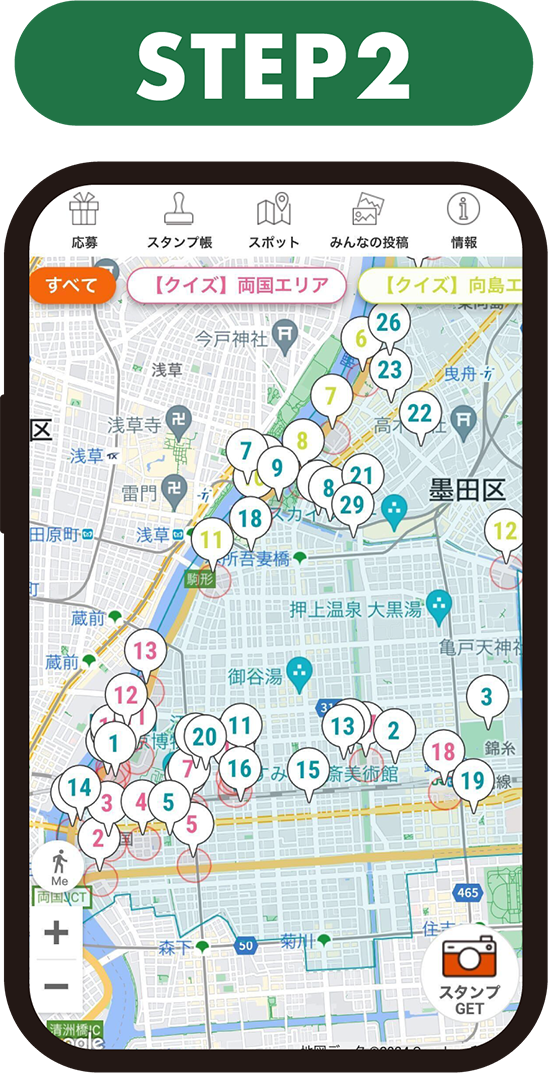 ・スタンプラリーのスポット内であっても、電波状態が悪い時などは位置情報が取得できない場合があります。